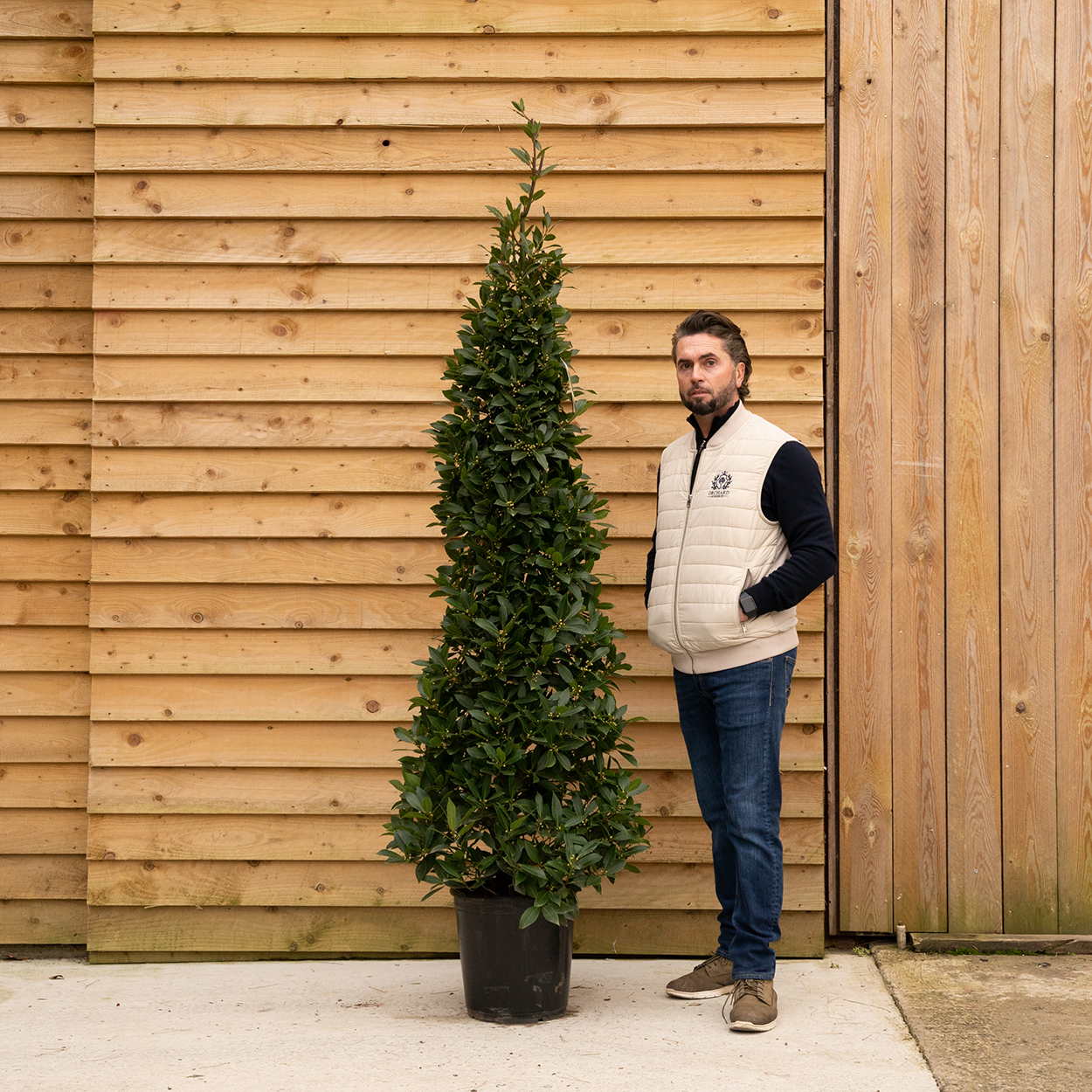 The Bay Cone, derived from the aromatic Laurus nobilis, is an elegant evergreen topiary that brings a touch of classic charm to any outdoor setting. Its rich, glossy foliage is artfully shaped into a conical form, creating a stunning visual accent perfect for formal gardens, pathways, or patios.